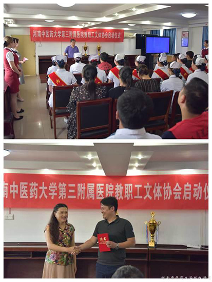 工会副主席吴金苗宣读了《河南中医药大学第三附属医院教职工文体协会管理办法》,计生办主任丁卫卫宣读了礼仪和篮球协会第一届理事会成员名单。在大家热烈的掌声中,篮球协会会长蔡庆春接过张大伟院长授予篮球协会的旗帜。并表态,今后协会要建章立制,找准定位,在做好临床工作的同时,把协会组织好、发展好,争取成为各协会的标杆。紧接着郭书敏主席为篮球协会特聘教练孙东阳颁发聘书,孙东阳教练是郑州市二十三中体育教研室教师,曾指导我院篮球协会参加学校教职工篮球联赛,连续两年获得冠军。随后,张大伟院长为礼仪协会会员代表发放礼仪服装,张晓黎主任、吴金苗副主席共同为会员佩戴绶带。礼仪协会会长姜楠说,会员们穿上礼仪服装,戴好绶带意味着要更加严格的要求自己,承担更多的责任。不但要管理好个人形象,而且要丰富内在的涵养。做一个自主独立、自信优雅、宽容务实、工作能力强的新时代女性。随后礼仪协会副会长马明睿代表会员发表感言,表示今后要发扬无私奉献的精神,顾全大局,树医院形象、扬女性风采。