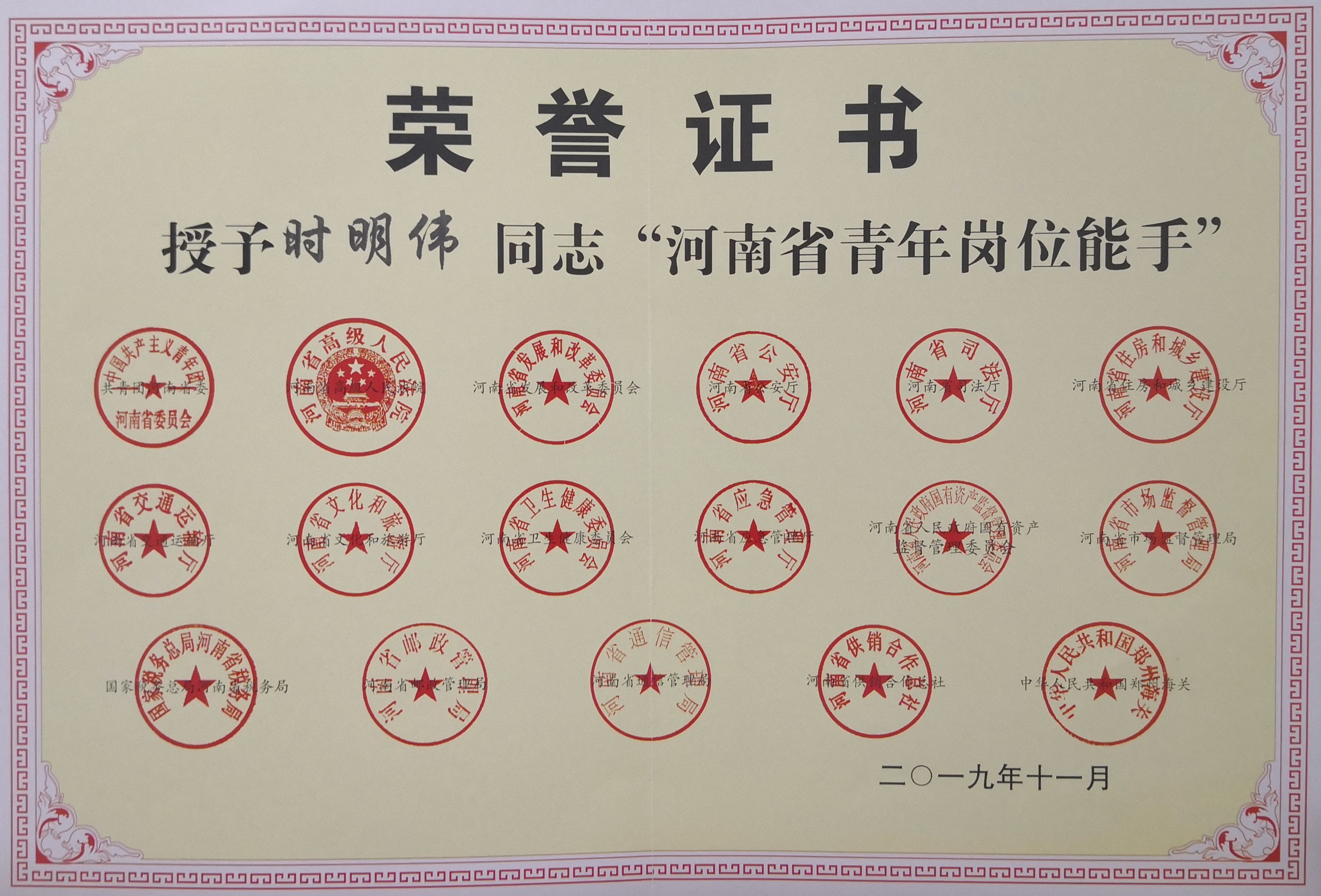 为选树典型,引导广大青年同志立足本职,奉献青春力量。近日,共青团河南省委下发《关于评选表彰2017-2018年度河南省青年文明号和青年岗位能手的通知》(豫青联字〔2019〕13号),我院治未病科时明伟同志荣获“河南省青年岗位能手”称号。