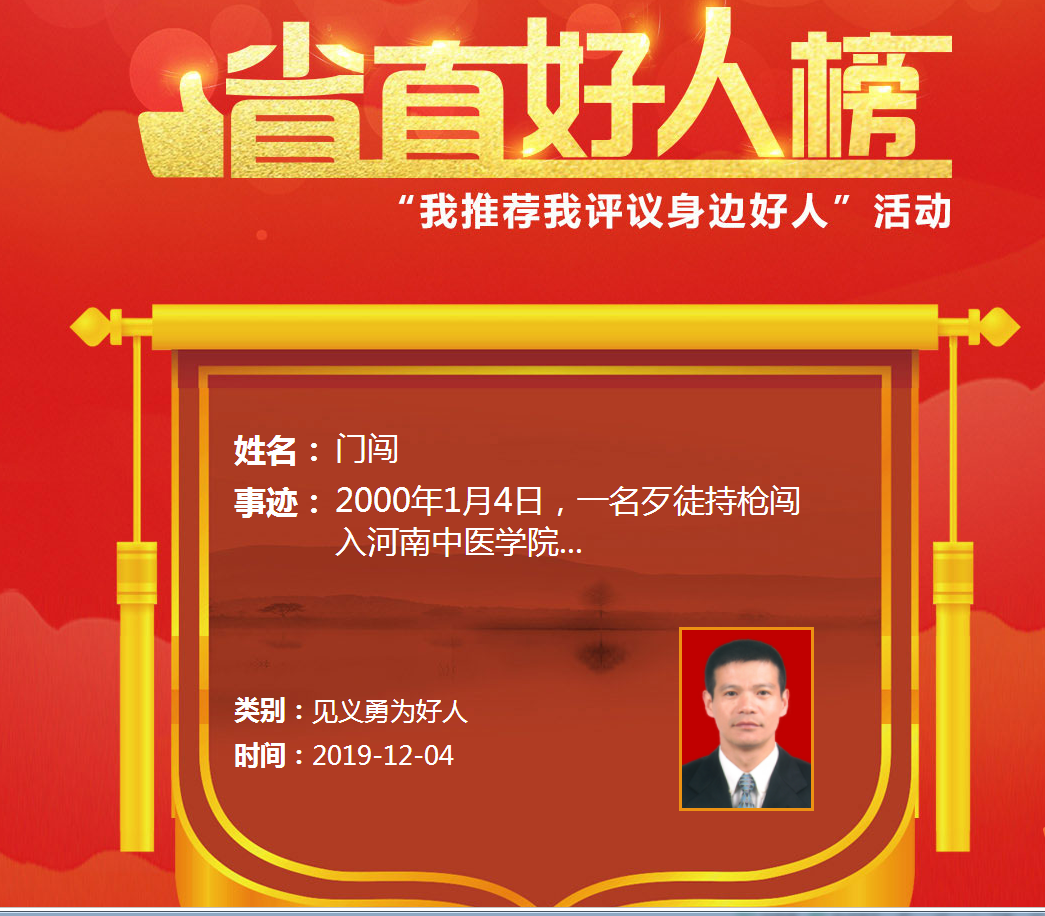 近日,为扎实推进“我推荐、我评议身边好人”活动,河南省直文明委持续选树2019年第四季度事迹突出、群众公认、典型性强的“省直好人”,经各有关部门研究推荐,并经省直文明委评议审定,我院门闯同志荣获由河南省直文明委评选的2019年河南省直第四季度“省直好人榜”—“见义勇为”上榜人物。