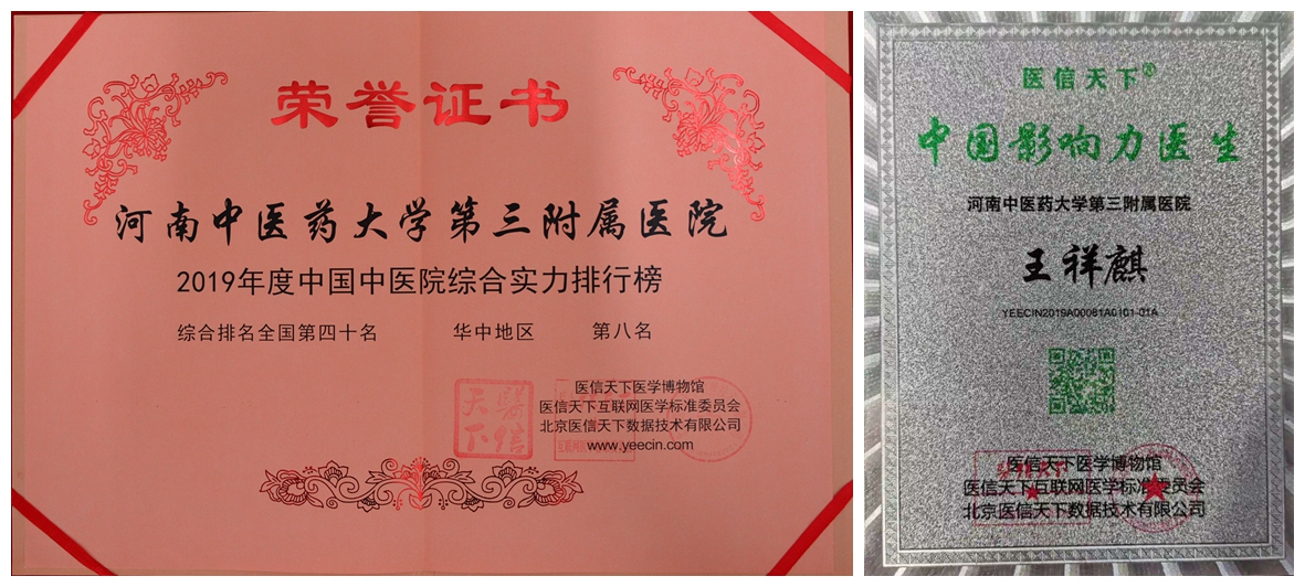 会上,发布了 2019年中国中医院综合实力排行榜综合榜、中医内科榜、中医外科榜和中医专业“中国影响力医生”。我院2019年度中国中医院综合实力全国排名第四十名、华中地区第八名,王祥麒教授荣获中医专业最具“中国影响力医生”。