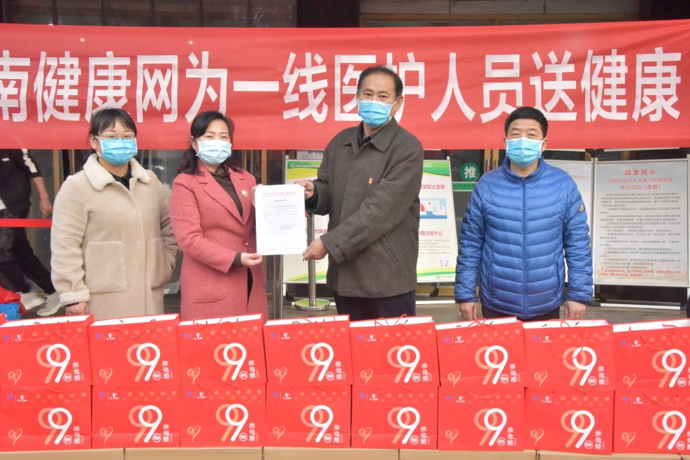 本网讯(文/孙璐 图/田辉)3月2日下午,我院收到了中建九九龄文化传播有限公司捐赠的九九龄维他醋100箱(1000盒),为我院坚守在工作岗位的医务人员奉献爱心。我院党委副书记袁晓宇、副院长张进一和党委宣传统战部、工会相关负责人出席捐赠仪式。