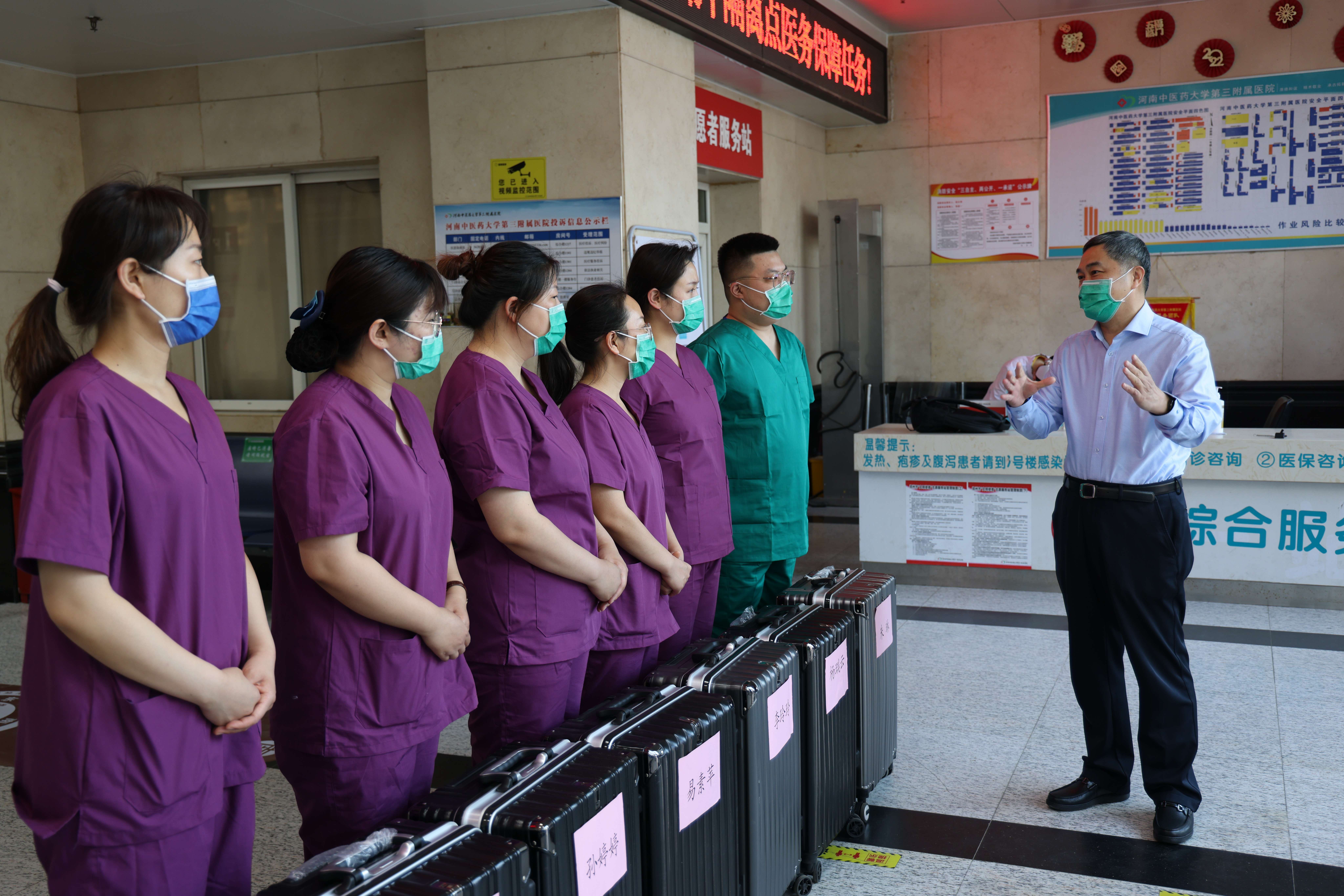 本网讯(通讯员潘向昆 图田辉) 2020年5月5日上午7:40,我院重症医学科李玲玲、骨伤科朱琳、肝胆脾胃病科一病区易素苹、疼痛科张茹佳、康复科一/二病区张婷婷、老年一病区杨瑞云6名医护人员参加郑州市金水区集中隔离点开展医务保障任务。院长张大伟、纪委书记刘会勋、副院长王志超、高翔、工会主席蔡庆春和相关部门同事到现场送队!