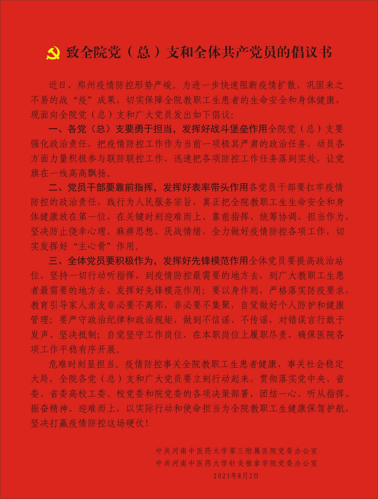 致全院党(总)支和全体共产党员的倡议书